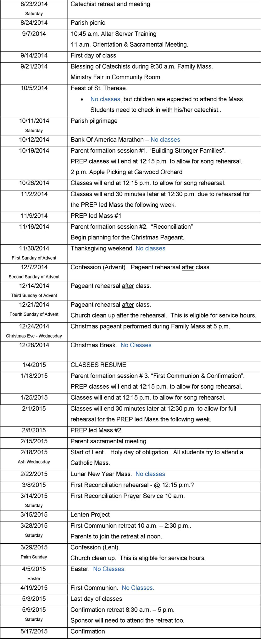 Classes are held every Sunday unless otherwise noted. First day: September 7, 2014 Start time: 10:45 a.m. Last day: May 3, 2015 End time: 12:00 p.m. Except on days noted. Anticipated number of sessions: 29