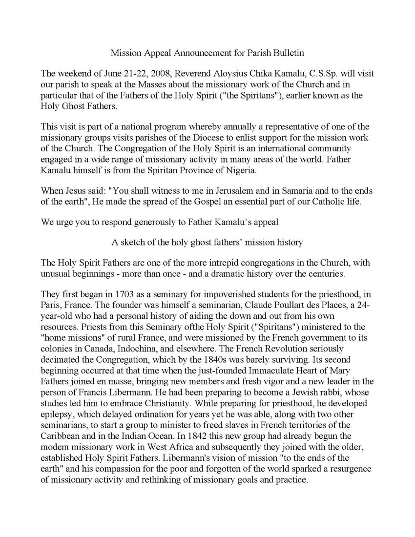 Mission Appeal Announcement for Parish Bulletin