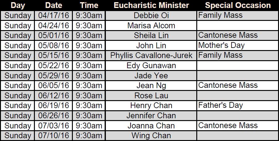 Please be at mass on time to participate in the procession The assigned person for that day is responsible to look for replacement and to ask for extra helper(s) as needed. If you see there isn't any Eucharistic Minister present, please go to the Altar during the appropriate time to assist with Communion. |